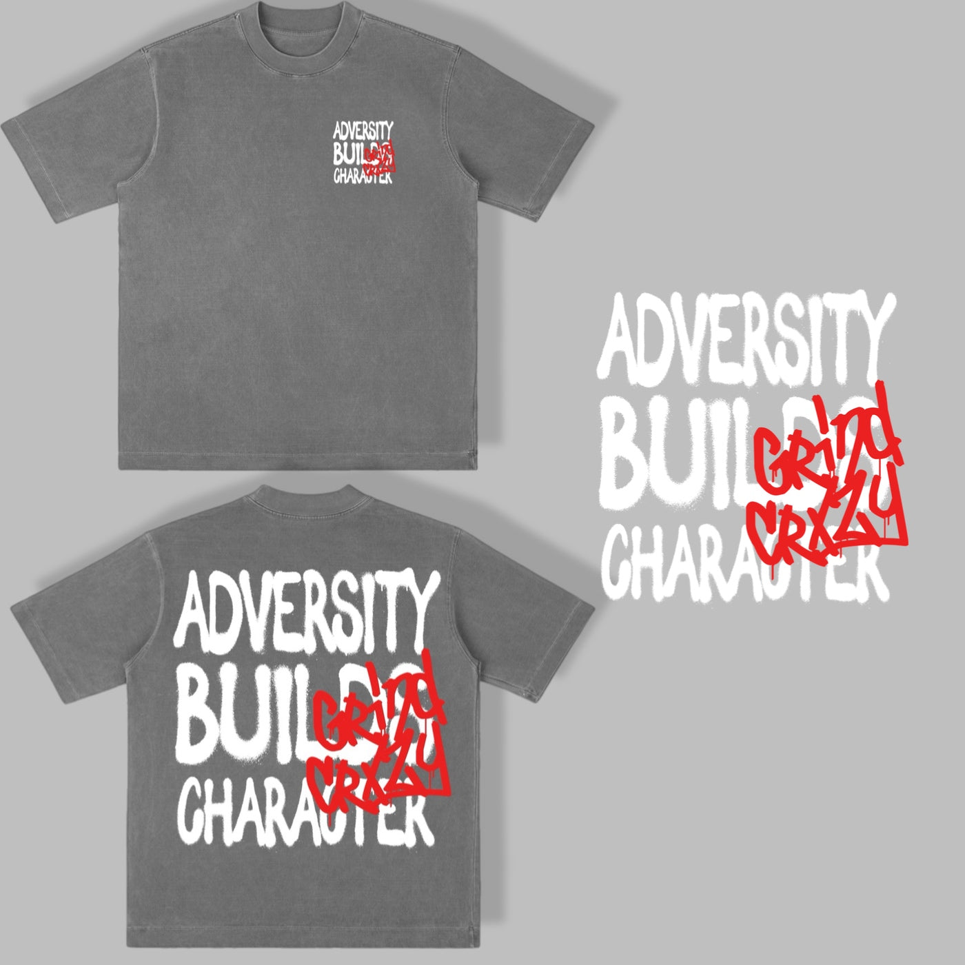 Washed Space grey oversized tee featuring a clean left-chest “Adversity Builds Character” graphic with a bold red accent — minimal, rugged, and built for everyday wear.